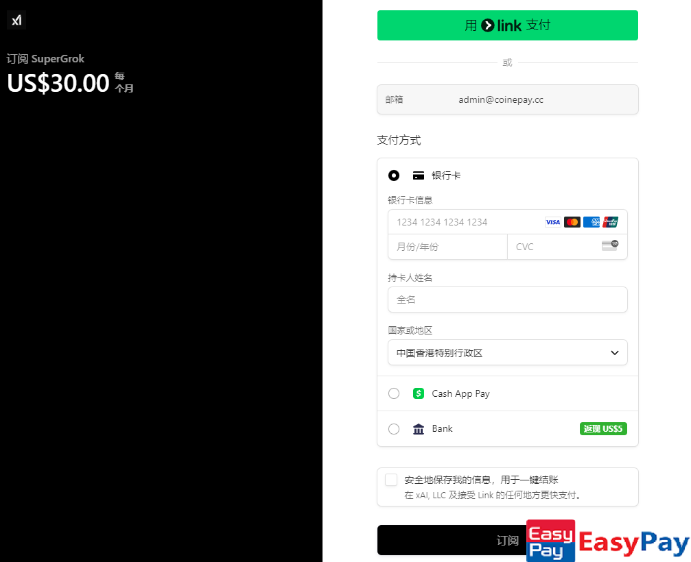 在实践中，我们推荐使用 **EasyPay 虚拟信用卡**（[点击注册开卡](https://easy-pay.site/home?ref=RVBFc3VUQ3dOSEAxMQ==)），它提供 Visa/MasterCard 通道，开卡仅需 3 美元，无月费，支持 USDT（TRC20）充值，并且兼容包括 SuperGrok 在内的主流海外订阅服务。如果支付中途遇到问题，还可以直接通过 [EasyPay 24小时客服](https://t.me/easypay_u) 获取支持，帮助解决绑定失败、余额不足或风控拦截等情况。