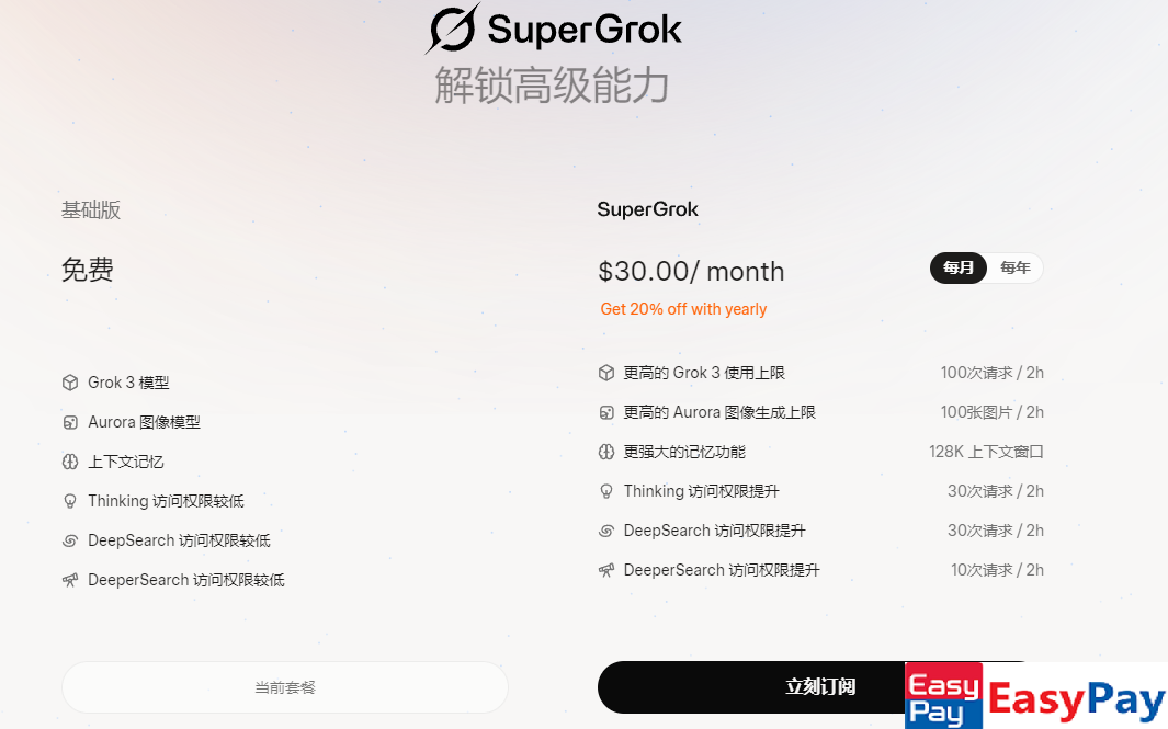 SuperGrok 提供月付和年付两种订阅方式，国内用户可根据需求选择：